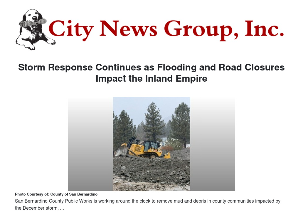 On Dec. 24, Governor Gavin Newsom proclaimed a state of emergency for San Bernardino County and several other counties impacted by the late December storms, including Los Angeles, Orange, Riverside, San Diego and Shasta. On Dec. 25, San Bernardino County CEO Luther Snoke declared a local emergency for San Bernardino County. These actions make the county and its residents eligible for forms of aid that might become available.