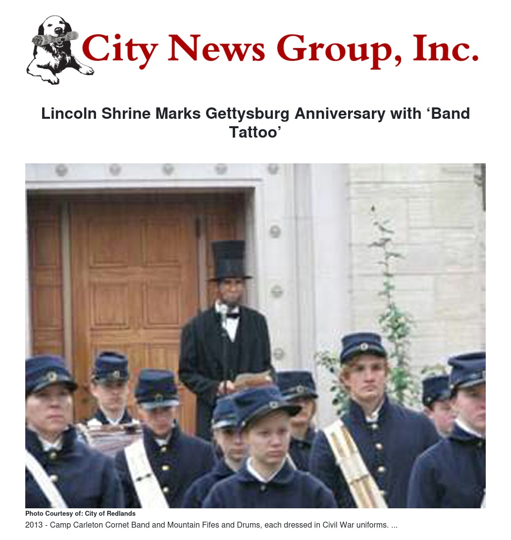 Lincoln’s “Gettysburg Address” has gone down in U.S. history, and to commemorate this pivotal moment the Lincoln Memorial Shrine in Redlands and Camp Carleton Cornet Band are hosting the second “Lincoln Shrine Band Tattoo” on Saturday, Nov. 22, from 10:30 a.m. to noon at the Shrine.