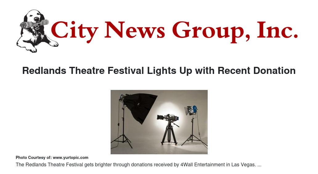 "4Wall Entertainment has provided the Redlands Theatre Festival with valuable lighting equipment and, in doing so, has enhanced the ability to bring its productions up to current standards and state of the art theatrical technology," said festival founder and producing director Cliff Cabanilla.