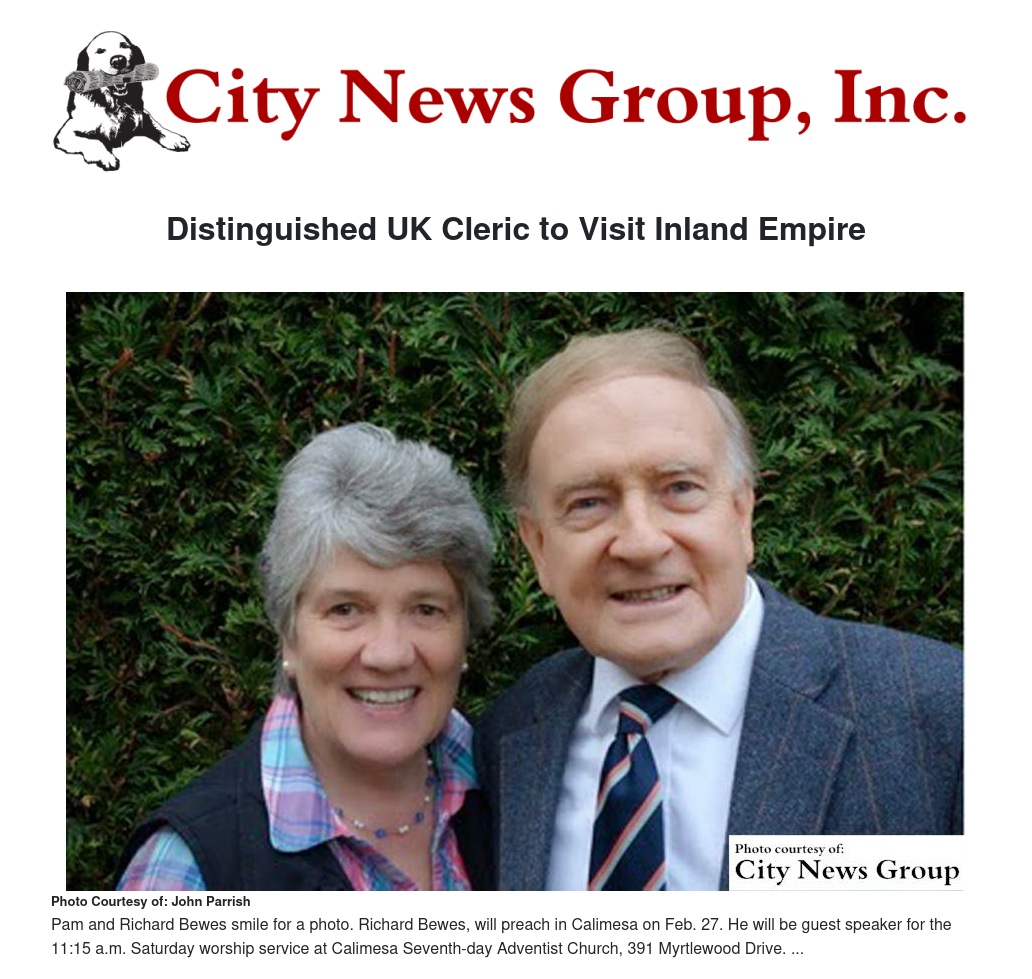 Richard Bewes’s speaking engagements have taken him into Europe, Australia, Africa, the USA, and Canada. He and his wife, Pam, are in southern California for lectures and appointments including a seminar with area Seventh-day Adventist pastors on March 1.