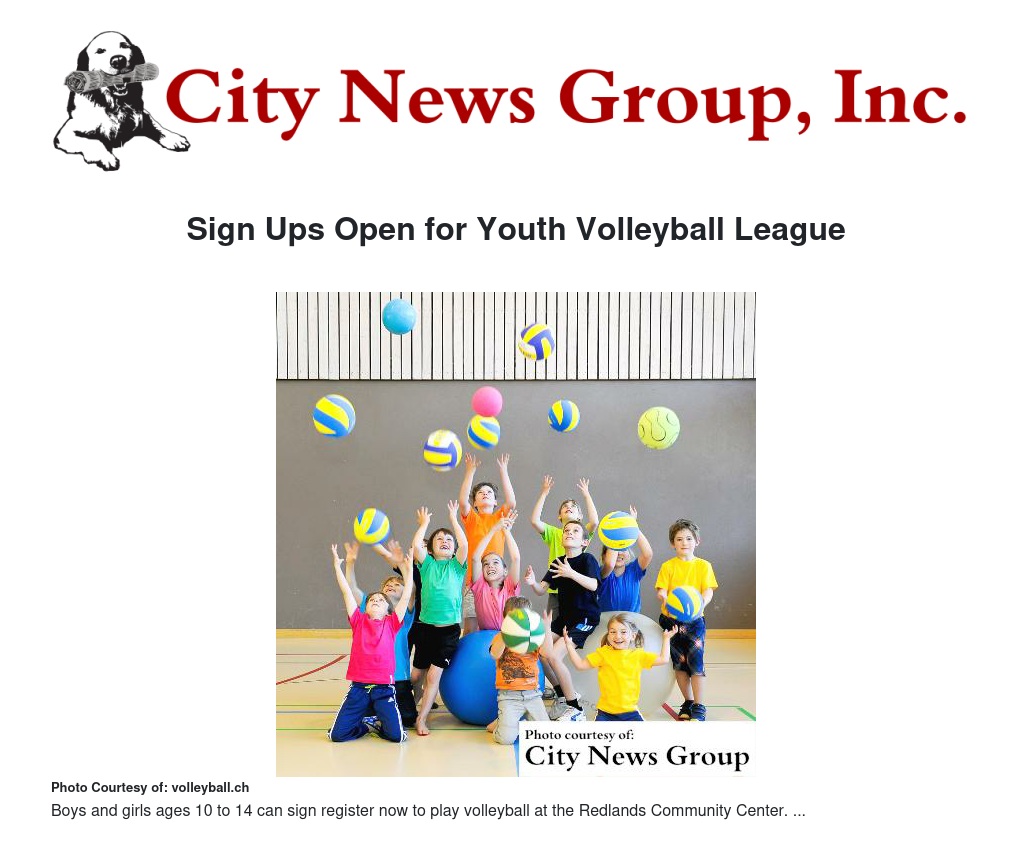 The Redlands Community Center is offering TriFytt Sports’ Volleyball League, for boys and girls ages 10 to 14 years old, at the Redlands Community Center.