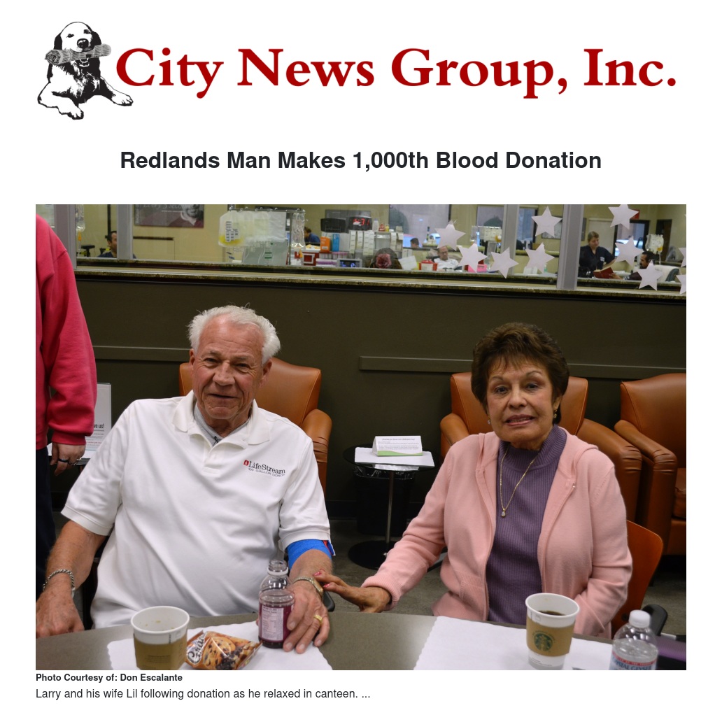 Larry Bloemsma, a 50-year Redlands resident, made his 1,000th blood donation on Thursday, February 6 at LifeStream, a local non-profit independent blood bank that provides blood products and services to over 80 Southern California hospitals.