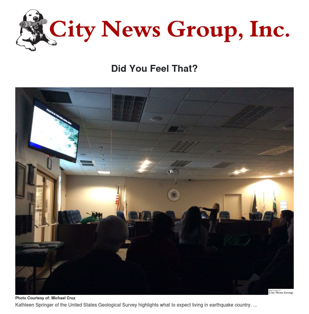 By the end of the meeting, with all the information provided, Springer imparted this one last final word of advice, “My big thing is getting people to care about the ground they’re standing on. What it means to your lives to live here in earthquake country. It’s almost like a really big responsibility; you can't have your head in the sand. It’s going to happen.”