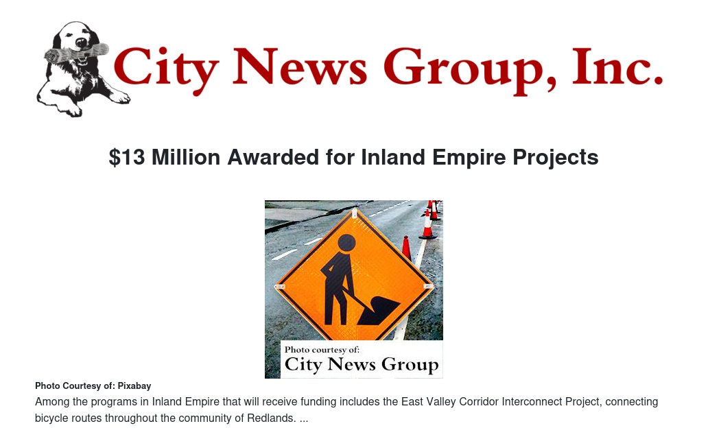 In Redlands, the East Valley Corridor Interconnect Project, connecting bicycle routes throughout the community, was approved for $2.06 million in funding.