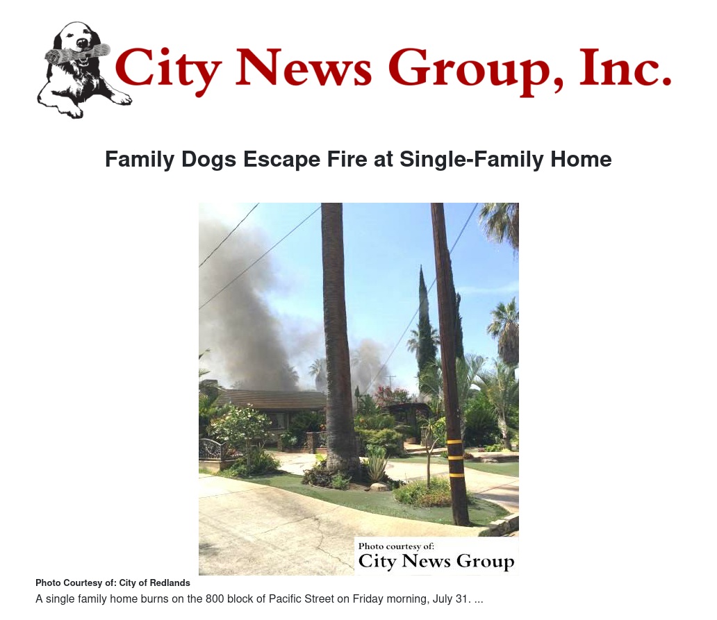 No injuries were reported, but three dogs were rescued when Redlands Firefighters responded to a structure fire in the 800 block of Pacific Street Friday morning, July 31.