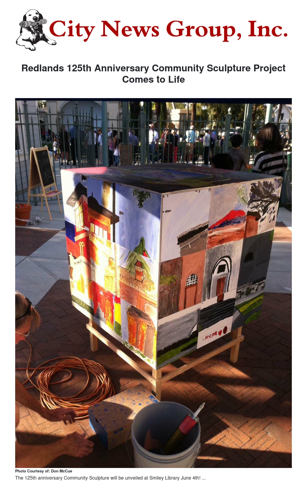 The Redlands quasquicentennial commemoration may have come to an end, but the spirit which it engendered continues. The year-long 125th anniversary celebration included several outlets for the people of the community to gather together and unite in one celebratory voice. One such platform was the 125th anniversary Community Sculpture Project. During the month of June the sculpture arising from that project will be on display at the Smiley Library in downtown Redlands. The public is invited to a special unveiling ceremony for the sculpture, which will take place in the reference wing of the library at 4 p.m. on Friday, June 5.