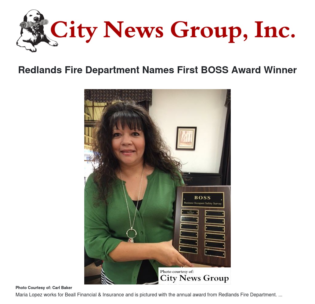 REDLANDS>> The Redlands Fire Department named Richard Beall of Beall Financial & Insurance as the recipient of the inaugural “BOSS” (Business Occupant Safety Survey) award, which was announced Friday, Dec. 9, at the Redlands Fire Department Family Festive Friday event.