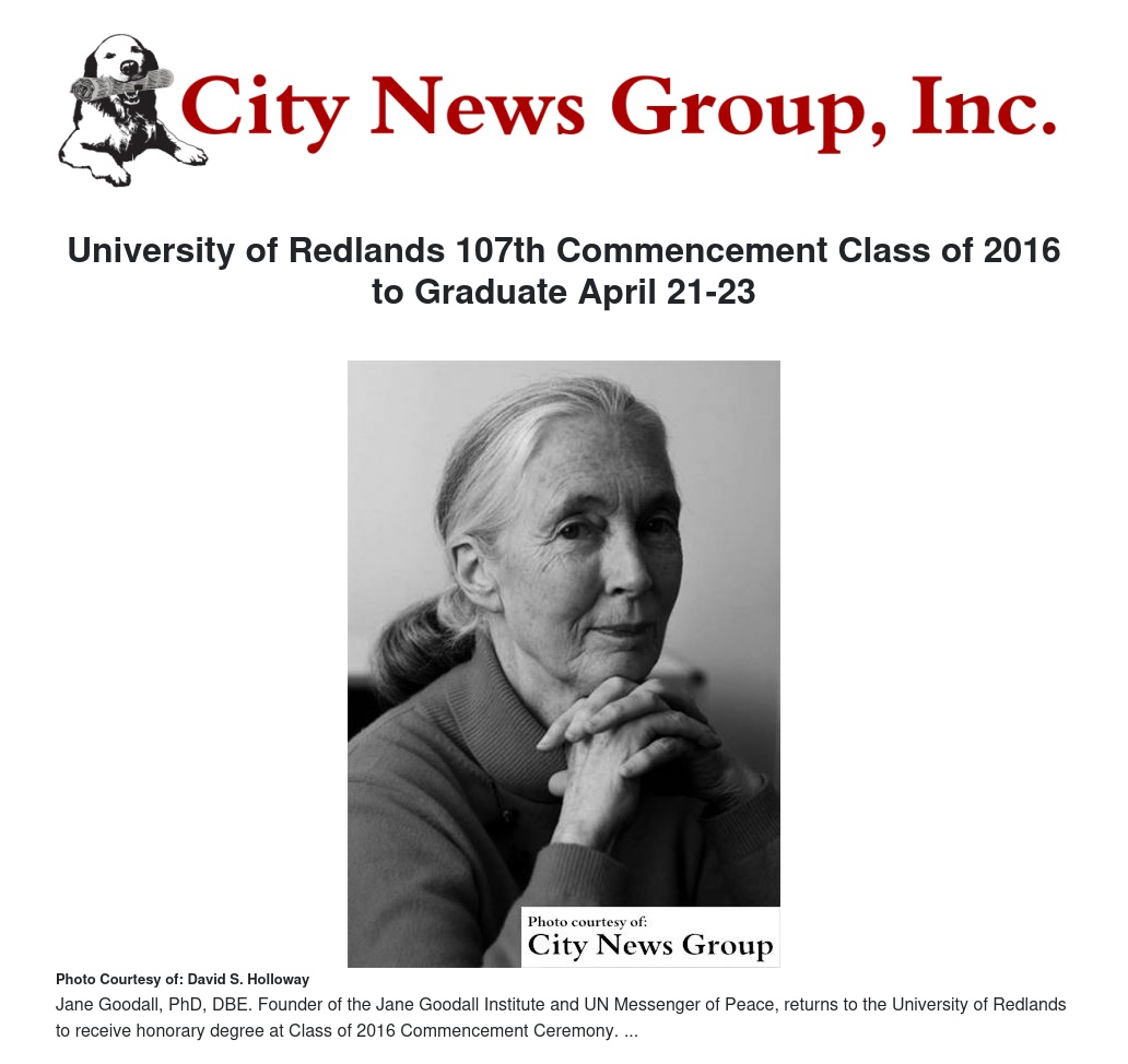 Dr. Jane Goodall, DBE, world-renowned conservationist, ethologist and UN Messenger of Peace, will return to the University Saturday, April 23 to receive the honorary degree Doctor of Humane Letters at the College of Arts & Sciences ceremony. She last visited the University in 2011 when she addressed a sold-out audience in the Memorial Chapel, and will this year offer the keynote address at the College of Arts & Sciences ceremony. Though this commencement ceremony is not open to the public, Goodall’s remarks will be posted on our website at Redlands.edu shortly after the ceremony.