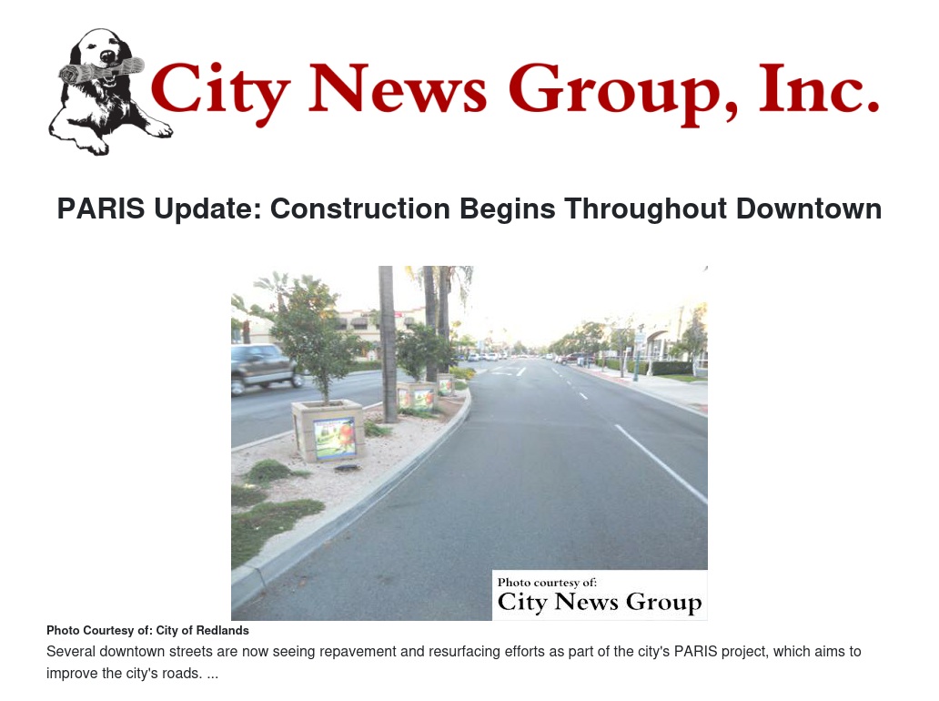 Repaving on Sixth Street between Citrus and Olive began July 6 and work to improve East State Street as well as Sixth, Seventh, Eighth, Ninth and portions of Fifth Street between Redlands Boulevard and Citrus Avenue began. The streets will be closed to automobile traffic for up to two weeks, beginning July 13. All businesses will remain open and the city is taking additional measures to assist visitors in reaching their destinations along those streets.