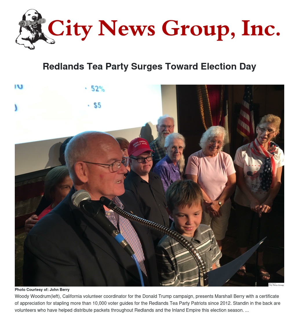 To volunteer for the Trump campaign, click Donald Trump California Volunteers. To volunteer with the Redlands Tea Party Patriots to help local candidates, email Cabinet@RedlandsTeaParty.net or go to www.ElectionIntegrityProject.com for helping the EIP project.