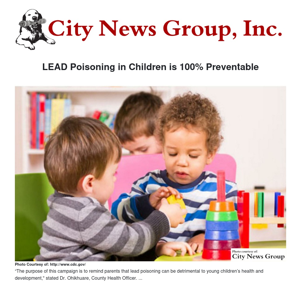 “The purpose of this campaign is to remind parents that lead poisoning can be detrimental to young children’s health and development. It is important for parents to ask their child’s doctor about lead testing,” stated Dr. Ohikhuare, County Health Officer. “Lead poisoning can seriously affect a child’s brain and nervous system. It can cause learning and behavioral problems. A blood lead test is the only way to identify and confirm lead poisoning in children.”