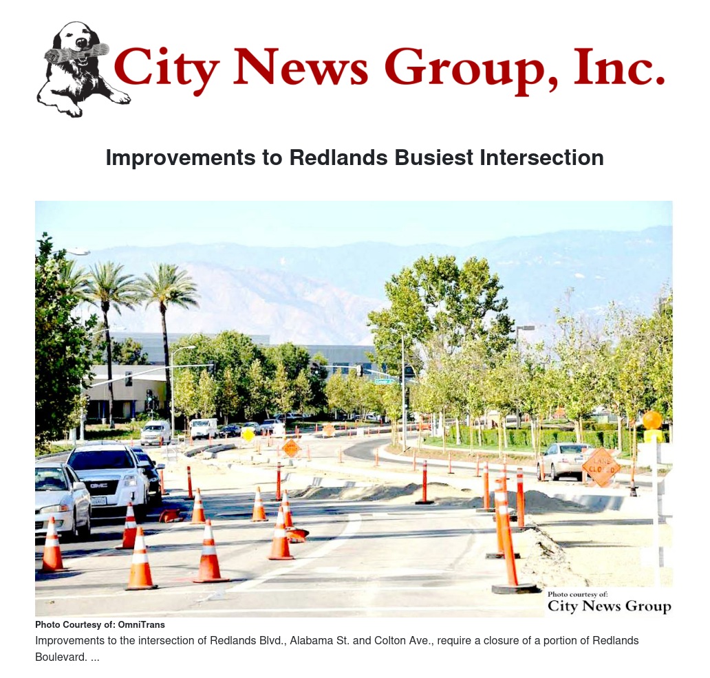 The approximately $4 million intersection construction project began in the summer of 2014 to realign the intersection of Redlands Boulevard and Alabama Street, the city’s busiest intersection, with more than 24,000 vehicles passing through the crossing daily.
