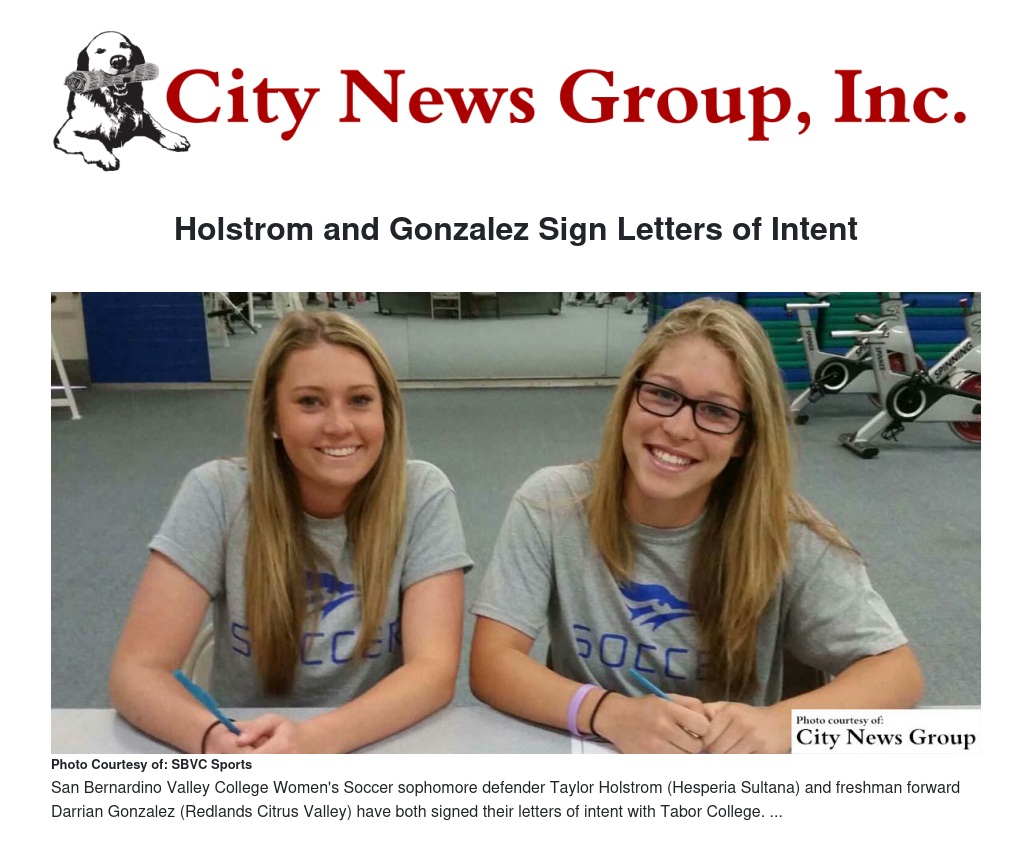 San Bernardino Valley College Women's Soccer sophomore defender Taylor Holstrom (Hesperia Sultana) and freshman forward Darrian Gonzalez (Redlands Citrus Valley) have both signed their letters of intent with Tabor College.