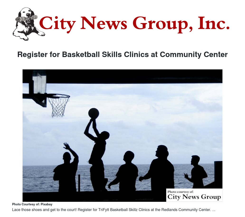 The Redlands Community Center is taking registration for TriFytt Basketball Skillz Clinics, an elite level training program utilizing a cutting edge basketball curriculum designed to empower and strengthen basketball players and help them take their games to the next level. Every athlete will get a program shirt.