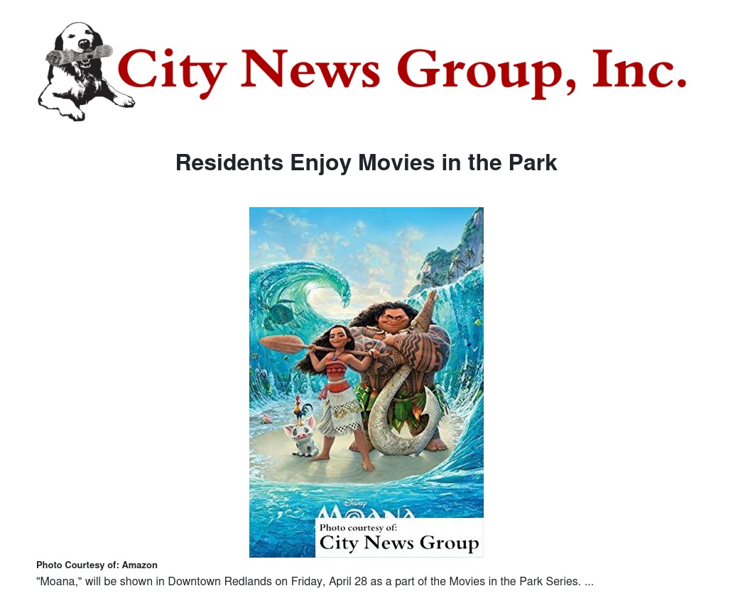 REDLANDS>> The City of Redlands, Movies in the Park Series, is set to air "Moana" on Friday, April 28 at State Street & 5th Street in Downtown Redlands.