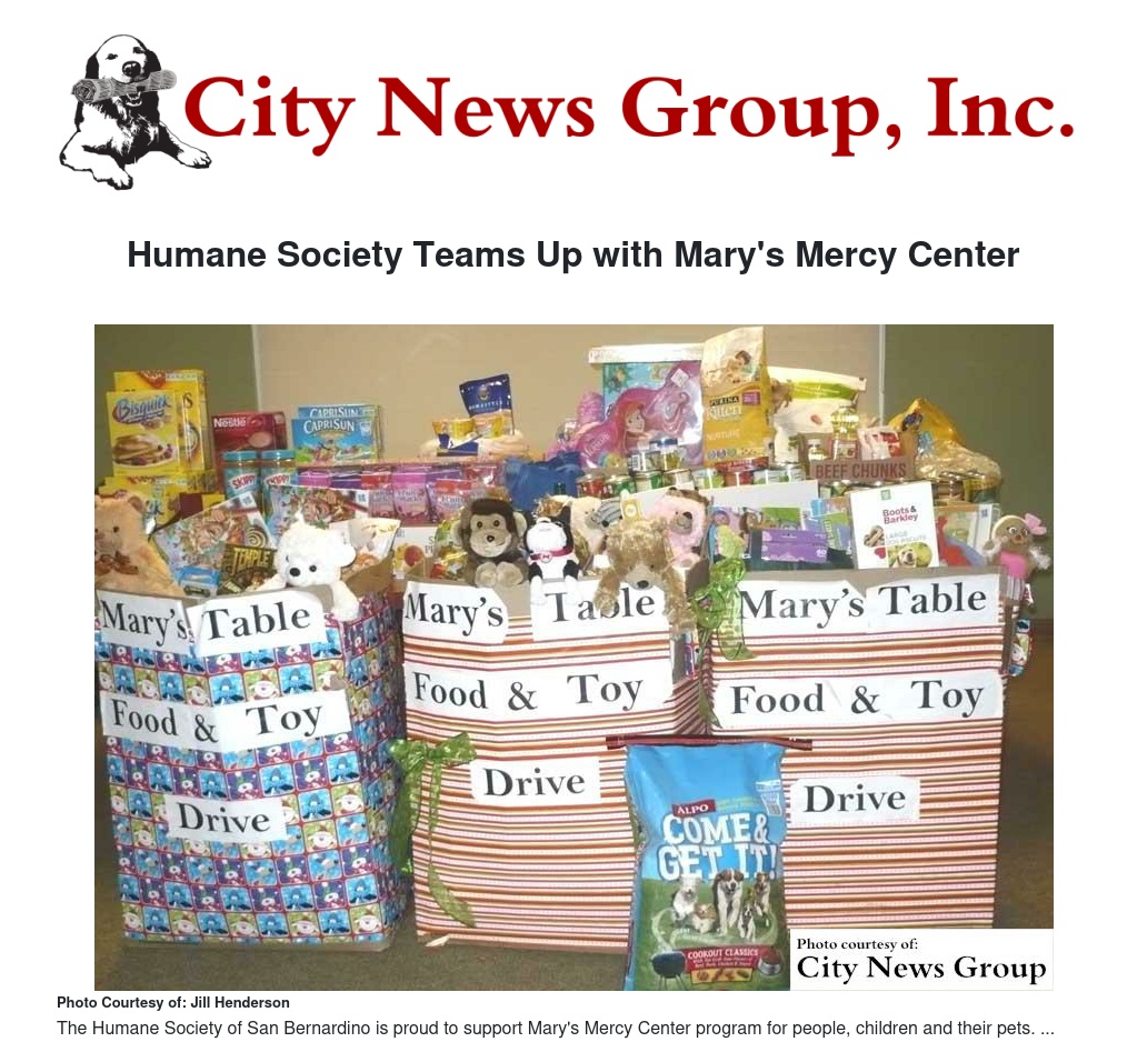 The Humane Society of San Bernardino Valley will be assisting Mary’s Mercy Center with their Annual Mary’s Table Food and Toy Drive by collecting food for people as well as pets, and new toys for children.