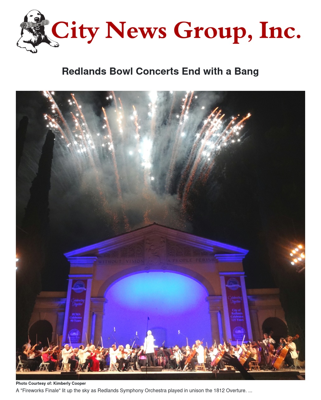 As the end began to draw near for the 90th Annual Summer Redlands Bowl Music Festival, the Redlands Symphony Orchestra literally went out with a bang, upholding the theme “Fireworks Finale,” playing Tchaikovsky’s 1812 Overture as a display of fireworks lit up founder Grace Stewart Mullen’s “The Prosellis” outdoor theater in Smiley Park.