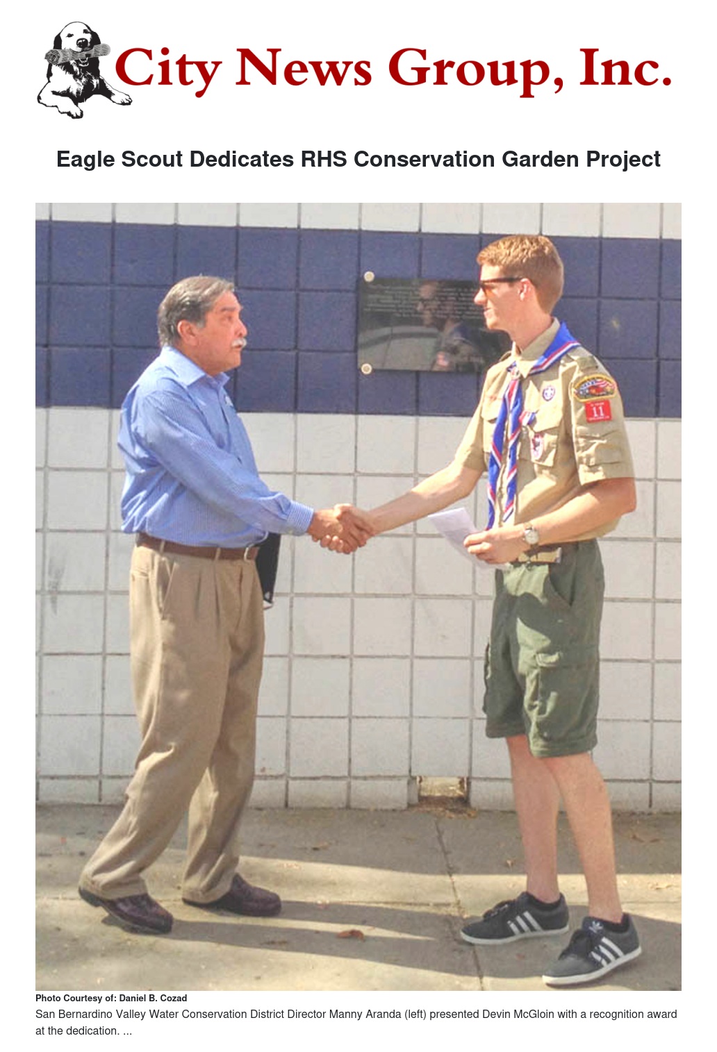 Eagle Scout Devin McGloin from Boy Scouts of America Troop 11 in Redlands dedicated his water conservation garden on the campus of Redlands High School (RHS) on Monday, Aug. 19. The dedication and placement of a plaque commemorated the more than 700 hours of work provided by almost 60 volunteers and contributions of donors that helped transform the area between the main gym and pools.
