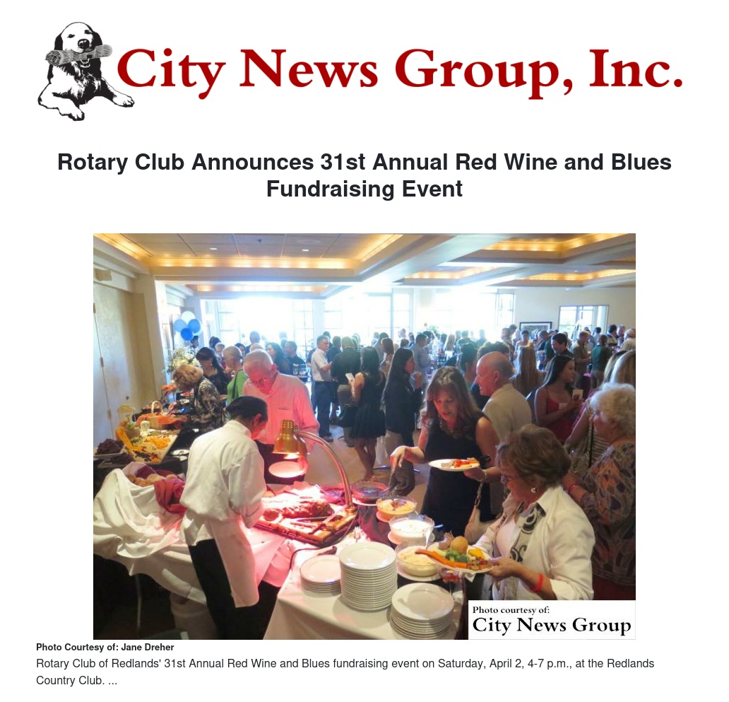 Wine tasting, craft beer sampling, gourmet food, live jazz music, silent and live auction items, opportunity drawings, and socializing with friends combine for the Rotary Club of Redlands' 31st Annual Red Wine and Blues fundraising event to be held on Saturday, April 2 from 4-7 p.m., at the Redlands Country Club.
