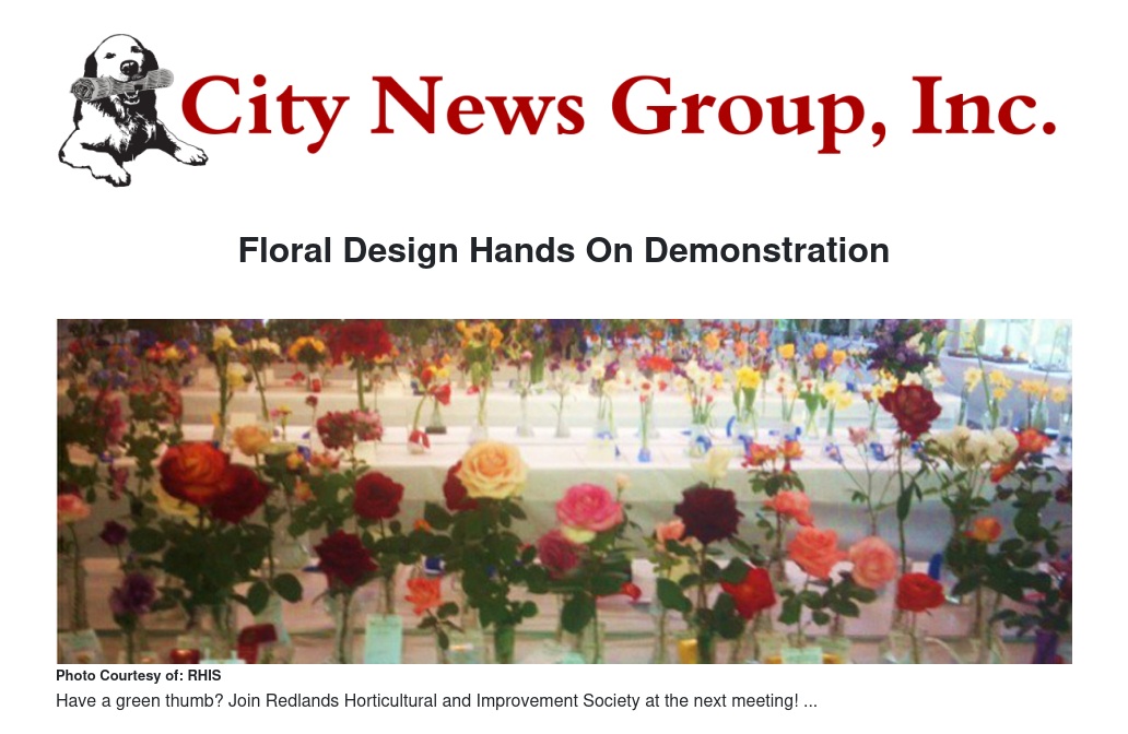 The April 5th meeting of the RHIS Floral Design Group will take place at 10 a.m. at Plymouth Village, 945 Salem Drive, Redlands.