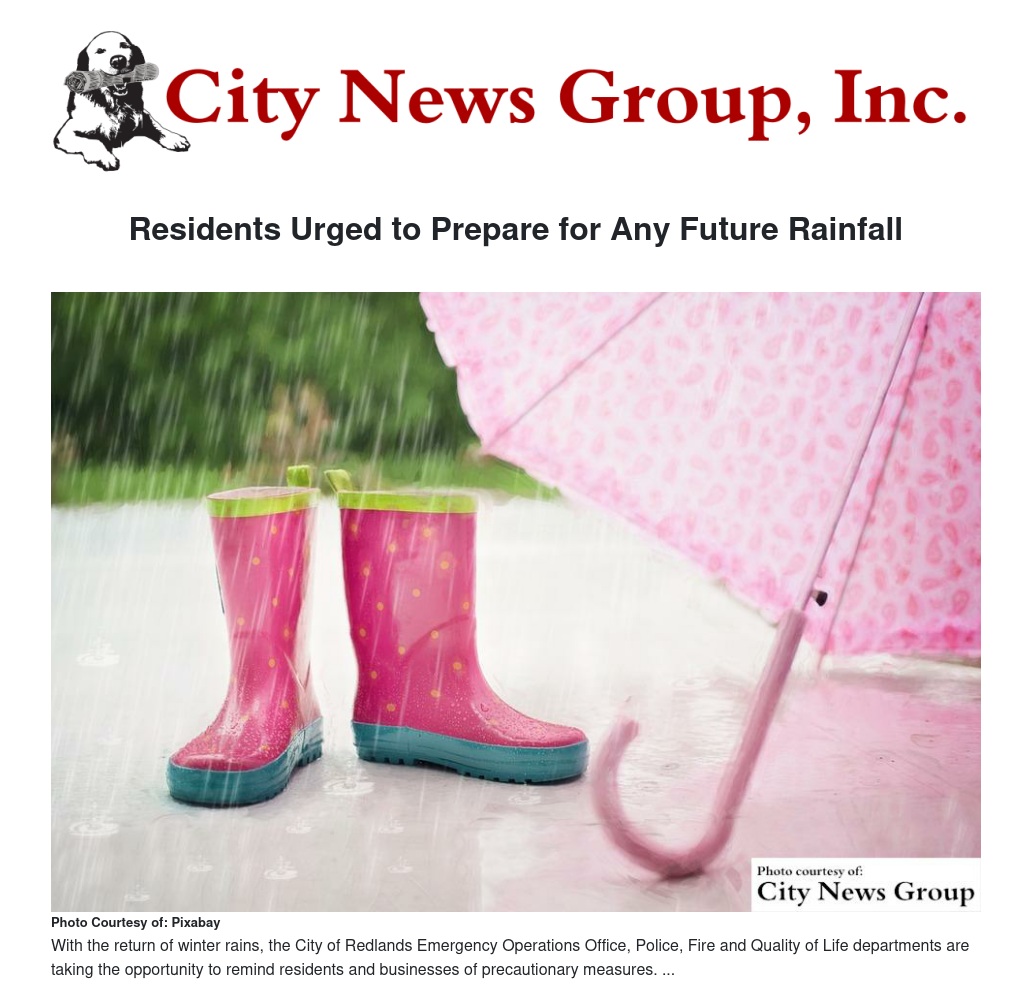 REDLANDS>> With the return of winter rains, the City of Redlands Emergency Operations Office, Police, Fire and Quality of Life departments are taking the opportunity to remind residents and businesses of precautionary measures they can take to protect their own health and safety.
