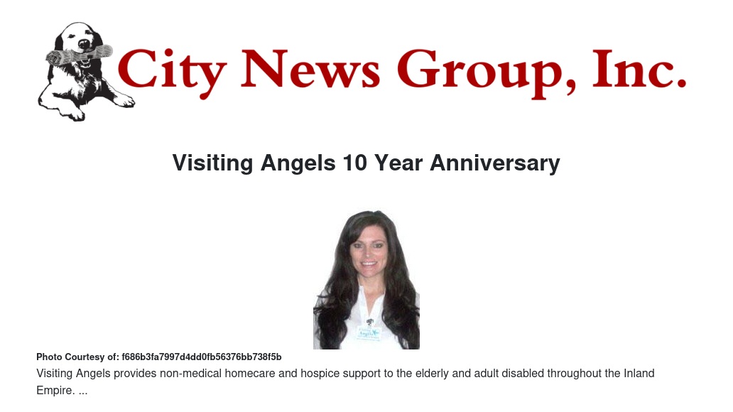 Congratulations to Brandon and Sara Hector, owners of Visiting Angels Non-Medical Homecare in Redlands, who celebrated the 10 year anniversary as owners/operators of Visiting Angels today. Visiting Angels provides non-medical homecare and hospice support to the elderly and adult disabled throughout the Inland Empire. Visiting Angels office has been in downtown Redlands since they opened in 2007, and has provided care for thousands of clients as far west as Rialto and east as Cabazon.