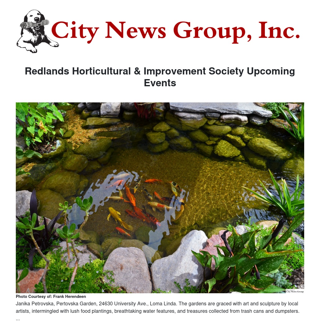 • Rehngren-McCoy Garden, 720 W. Crescent Ave., Redlands - Christina Rehngren-McCoy’s ‘Sunshine Serenity Garden’ was developed to create a beautiful ambiance for the marriage of the family's eldest daughter. The garden is the result of many weekends of labor and combined inspiration by all family members. The intent in designing the garden was to plant low-water plants. In addition, the planting areas around the perimeter was to be minimal in upkeep by putting in drip systems and covering the entire ground with golden rock, flagstones and wood chips. In the center of the yard is a planting area designed to break up the space into a small herb garden plus an open sunny space which can be modified according to the need of an event. There are two unique fountains to provide the background of soothing water flow. These have become favorites of local birds which now frequent the garden for water or a birdbath. The garden has become a favorite serene retreat to relax and enjoy at the beginning or the end of the day.