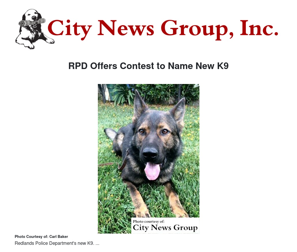 To enter, send an email that includes the entrant’s name, telephone number, email and the suggested name for the K9 officer to: k9namecontest@redlandspolice.org.