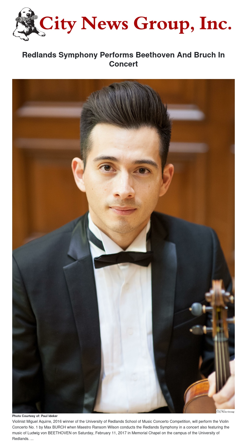 “The Violin Concerto by Burch is the composer’s most popular composition,” Wilson said. “It has been played regularly around the world by some of the great violin soloists; and now, Miguel Aguirre, here with the Redlands Symphony, will give the piece his own youthful vitality.”