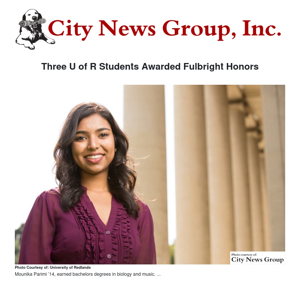 • Mounika Parimi ’14, double major, earning a bachelor’s degree in biology and a bachelor’s degree in music. Parimi is a scholar to Technische Universitat Dreseden, Germany, Research Department of Regenerative Therapies, focused on issues within type 1 diabetes. Since graduating from the University of Redlands in 2014, Mounika has, as she describes it, “…the privilege of practicing science as a research associate in the diabetes lab at the City of Hope in California.” The study she will undertake in Dresden, “… will take advantage of a clinical setting of islet transplantation, which is a therapeutic option for intractable cases of type 1 diabetes.”