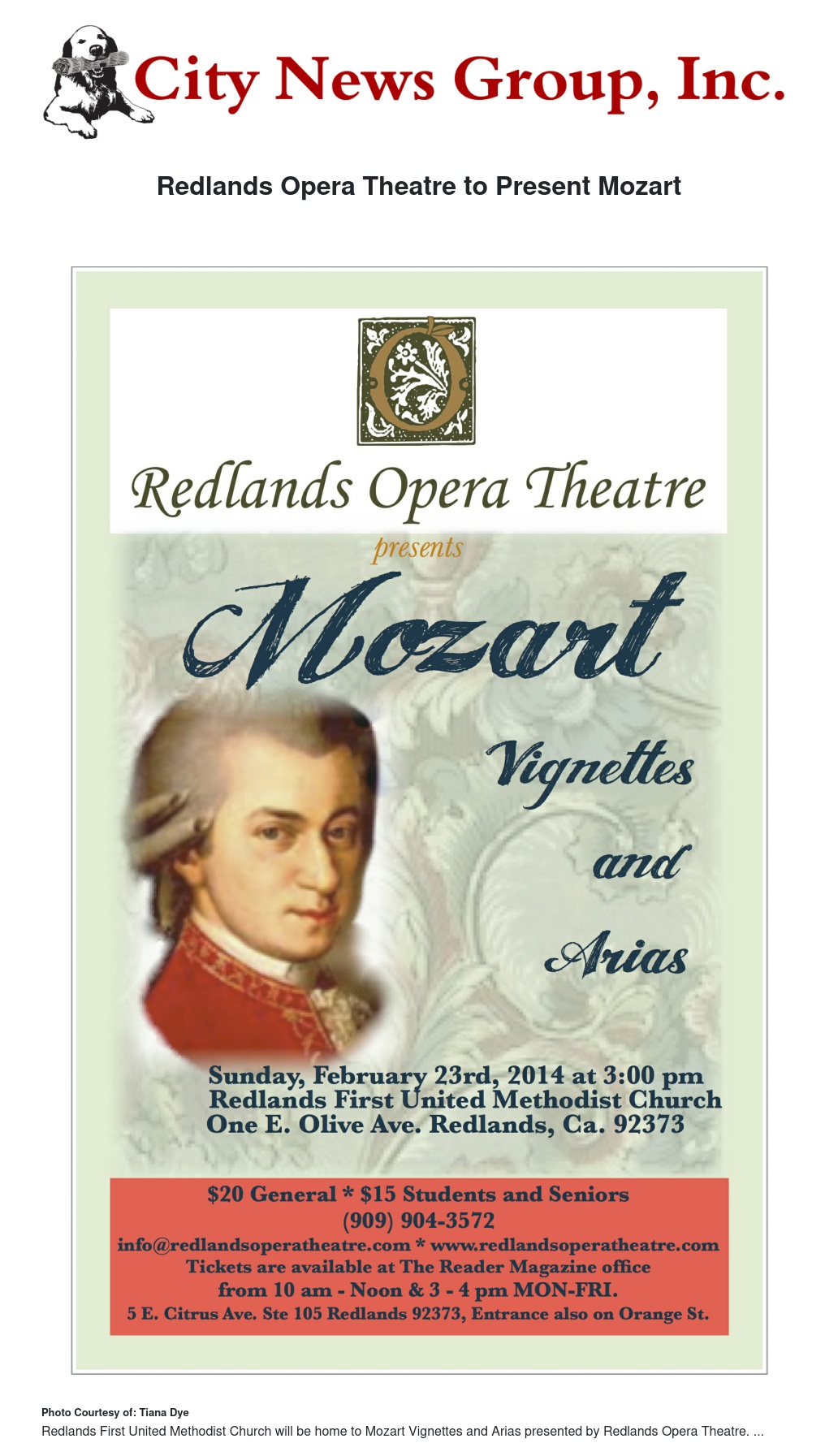 Redlands Opera Theatre presents Mozart Vignettes and Arias. The event will be held Sunday, February 23 at 3 p.m. at the Redlands First United Methodist Church.