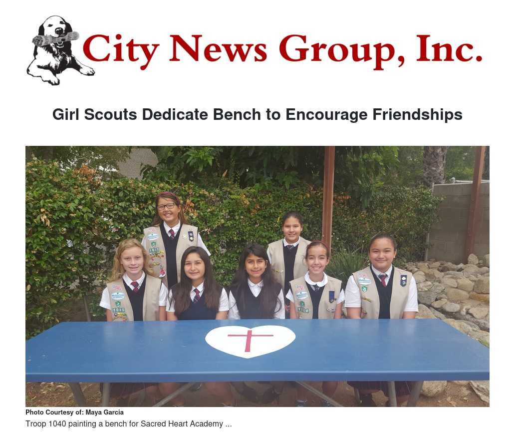 The students at Sacred Heart Academy (SHA) in Redlands will have a "new" bench to look forward to in the fall, thanks to Girl Scout Troop 1040. The Cadettes painted the bench, which was donated by Allan Bacon of TE Connectivity. The project was the culmination of their Amaze Journey, which focused on the twists and turns of relationships. Throughout the 2016-17 school year, the scouts discussed friendships, cliques, bullying, and self-improvement. At the end of the Journey, the scouts needed to complete a Take Action project that reflected what they learned during their journey. The scouts decided to paint the bench to encourage students of all ages to sit and form friendships. They painted it at the end of the school year. The primer and paint was generously donated by Harry Coe, SHA board member and parent. The bench was painted in the school colors, red and blue, with the school logo, a heart with a cross inside. After it was painted, it was blessed with holy water by Father Hau, a priest at Holy Name of Jesus and presented to the entire school on the second to last day of school by the scouts. It is the hope of Troop 1040 that whoever sits at the bench feels welcomed and loved!