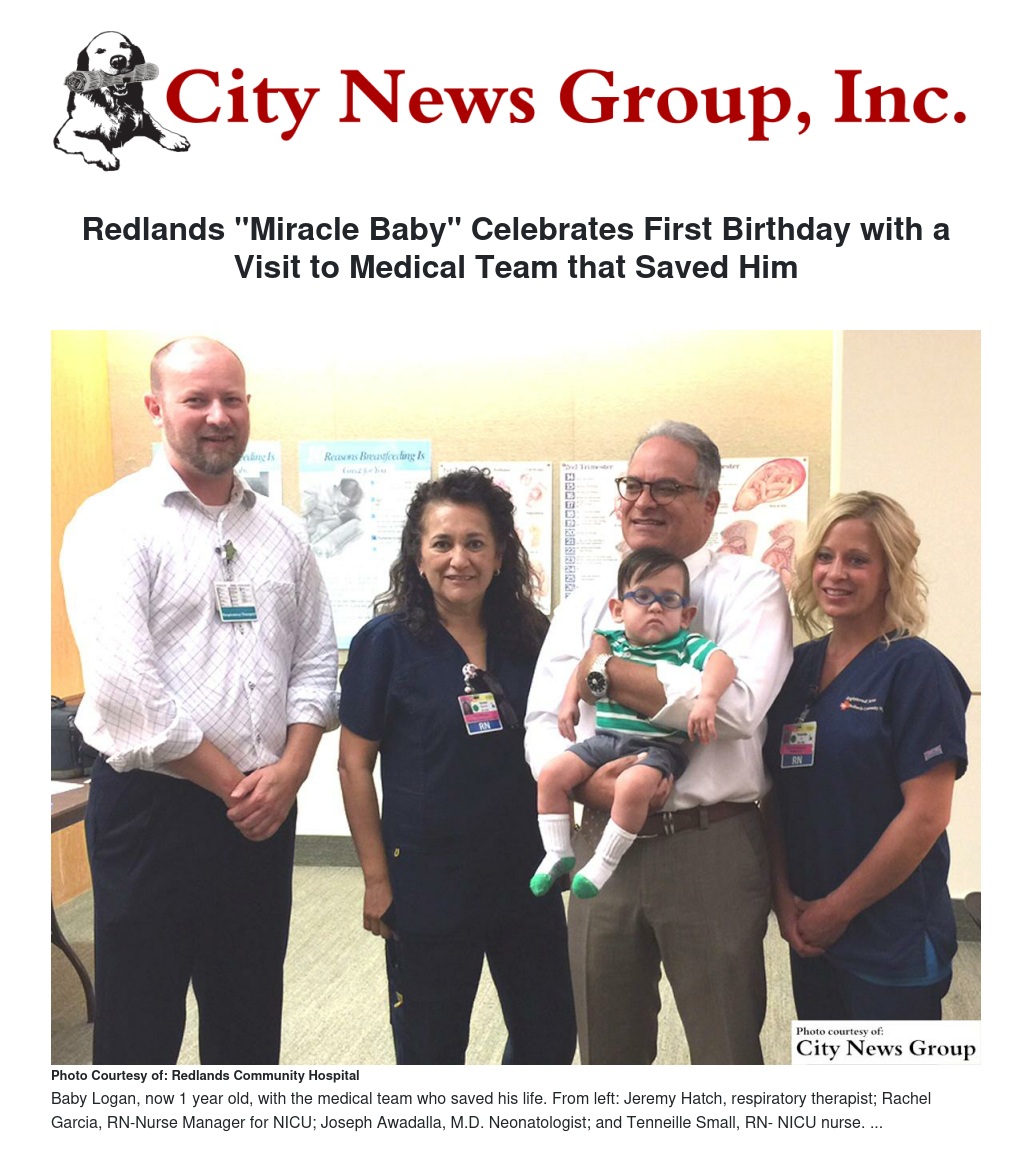 Redlands "Miracle Baby" Celebrates First Birthday with a Visit to Medical Team that Saved Him