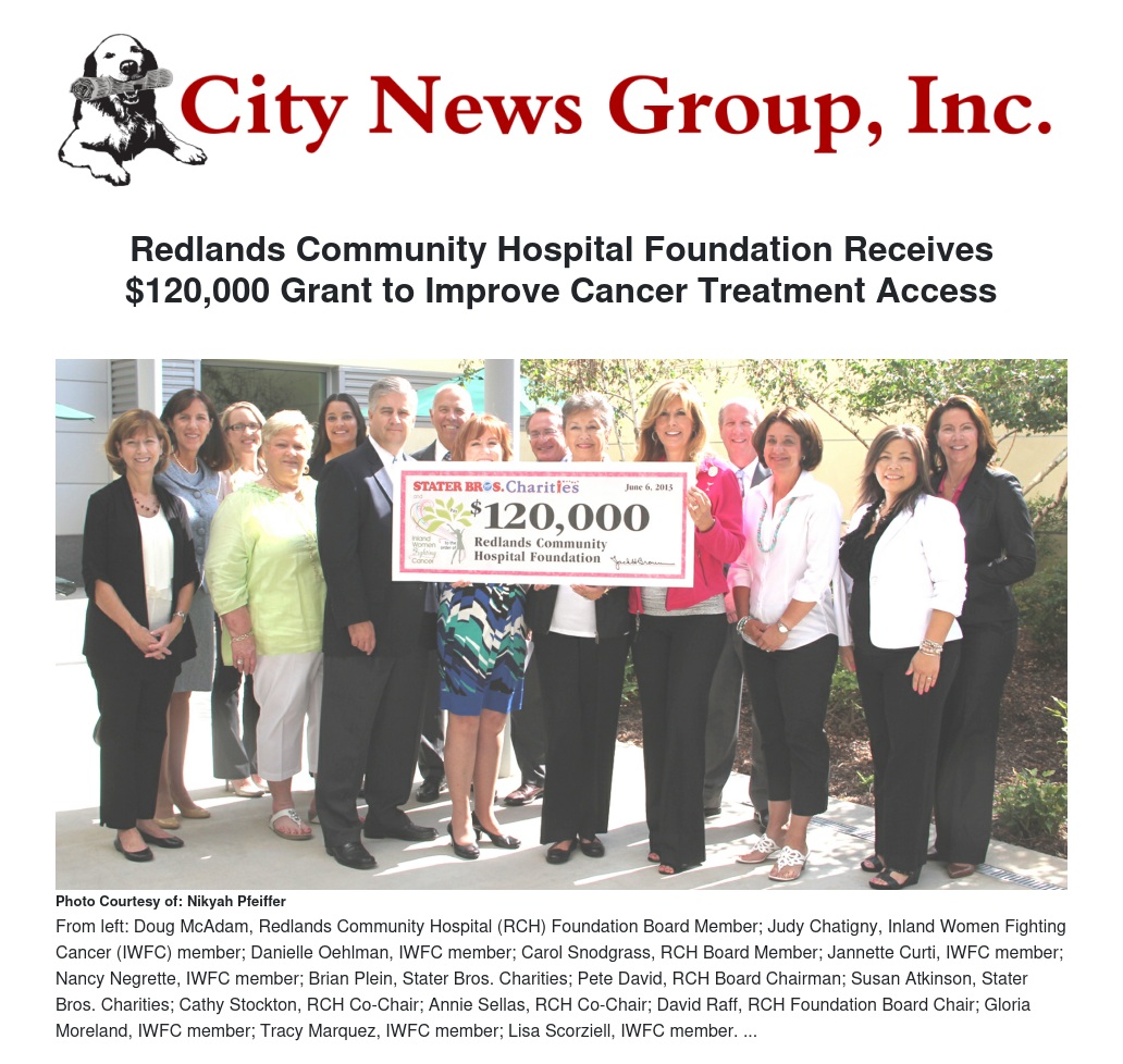 Redlands Community Hospital Foundation has received a $120,000 grant from Stater Bros. Charities and Inland Women Fighting Cancer to improve the access to care for cancer patients. A check presentation was held at Redlands Community Hospital (RCH) on Thursday, June 6, in the hospital’s Maternal Child and Surgery Services building.