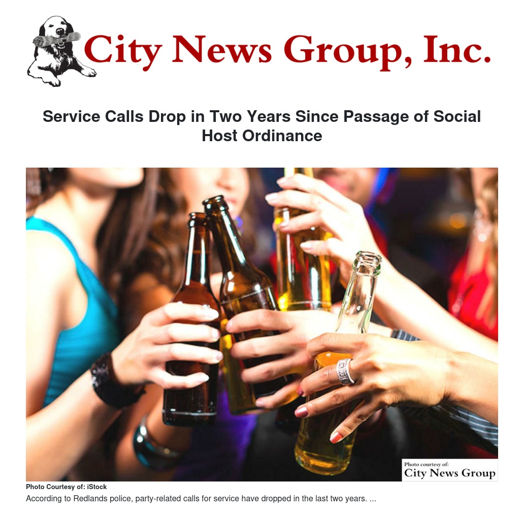 Redlands joined over 50 cities and eight California counties who also adopted social host ordinance laws. In Redlands, officials said, party calls for service, which include noise complaints and rowdy behavior, dropped from 1,242 calls in 2011, the year before the social host ordinance passage, to 1,075 in 2014.