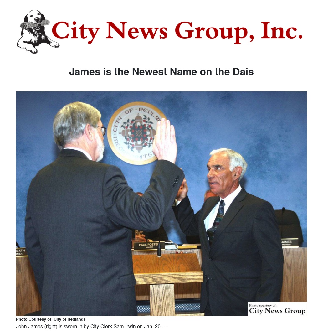 "I'm very honored to have been selected," John James said Jan. 20 as he took his newest seat on the Redlands City Council dais. "As a council, we certainly will do our duty to represent all the people in Redlands."