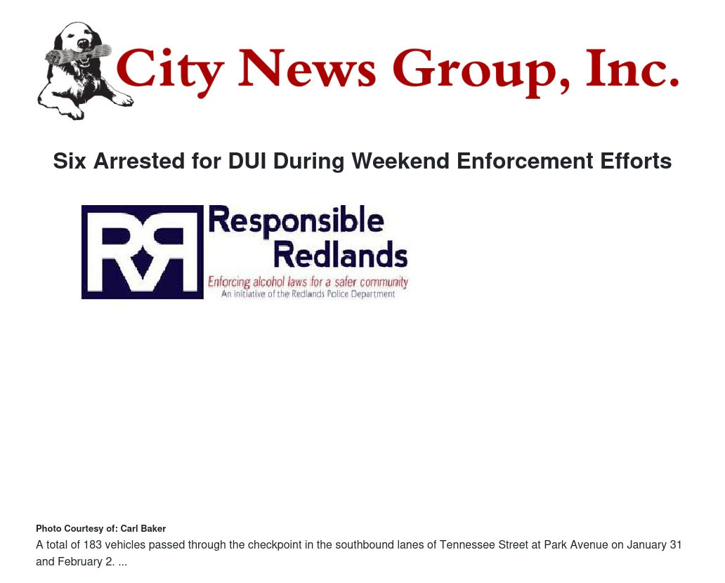 DUI checkpoints are a component of the Redlands Police Department’s Responsible Redlands initiative. The Redlands Police Department, with the support of state agencies, including the Department of Alcoholic Beverage Control and Office of Traffic Safety, the County of San Bernardino, and local businesses and community groups, launched the initiative in late August to focus on enforcing alcohol laws.