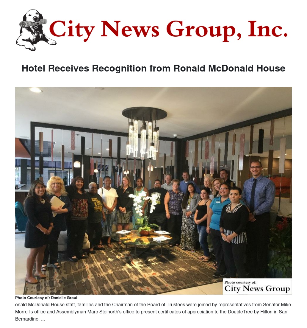 To show their appreciation Ronald McDonald House staff, families and the Chairman of the Board of Trustees were joined by representatives from Senator Mike Morrell's office and Assemblyman Marc Steinorth's office to present certificates of appreciation to the DoubleTree by Hilton in San Bernardino.