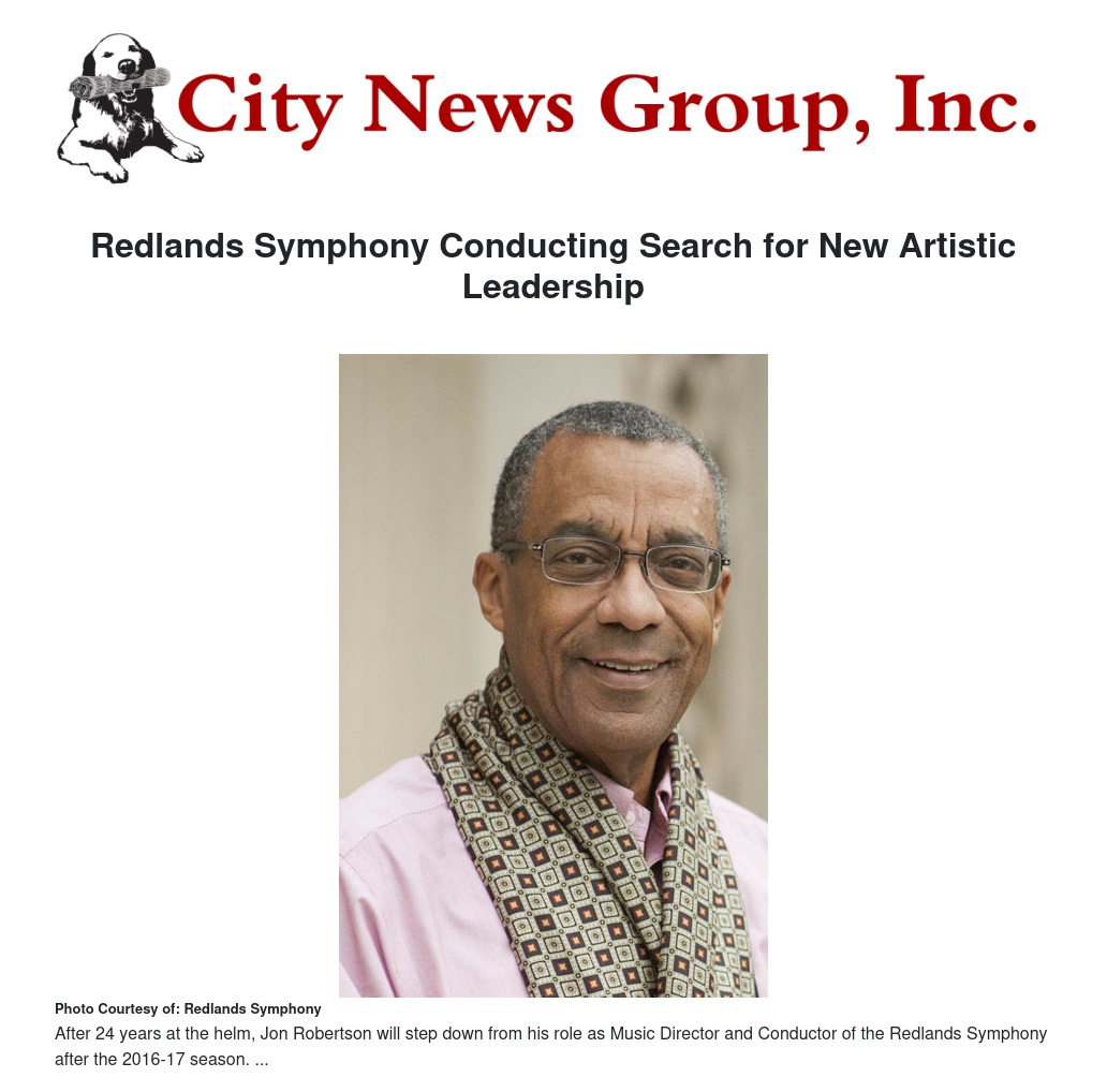 Jon Robertson, the Music Director and Conductor of the Redlands Symphony, will retire from the podium at the end of the orchestra’s 2016-17 season after 34 years as the organization’s artistic leader. The Symphony has launched an international search for a new artistic leader who will take over their duties in the fall of 2017.