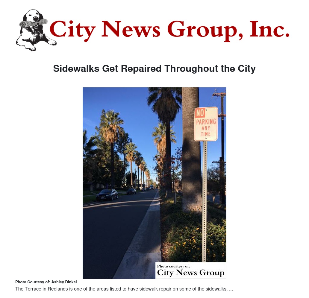 The 2016 Sidewalk Repair Project was designed and will be managed by the City’s Municipal Utilities and Engineering Department. For more information, contact Treasure Ortiz, public relations coordinator for the Municipal Utilities and Engineering Department at (909) 798-7524, ext. 2, or by email at tortiz@cityofredlands.org.