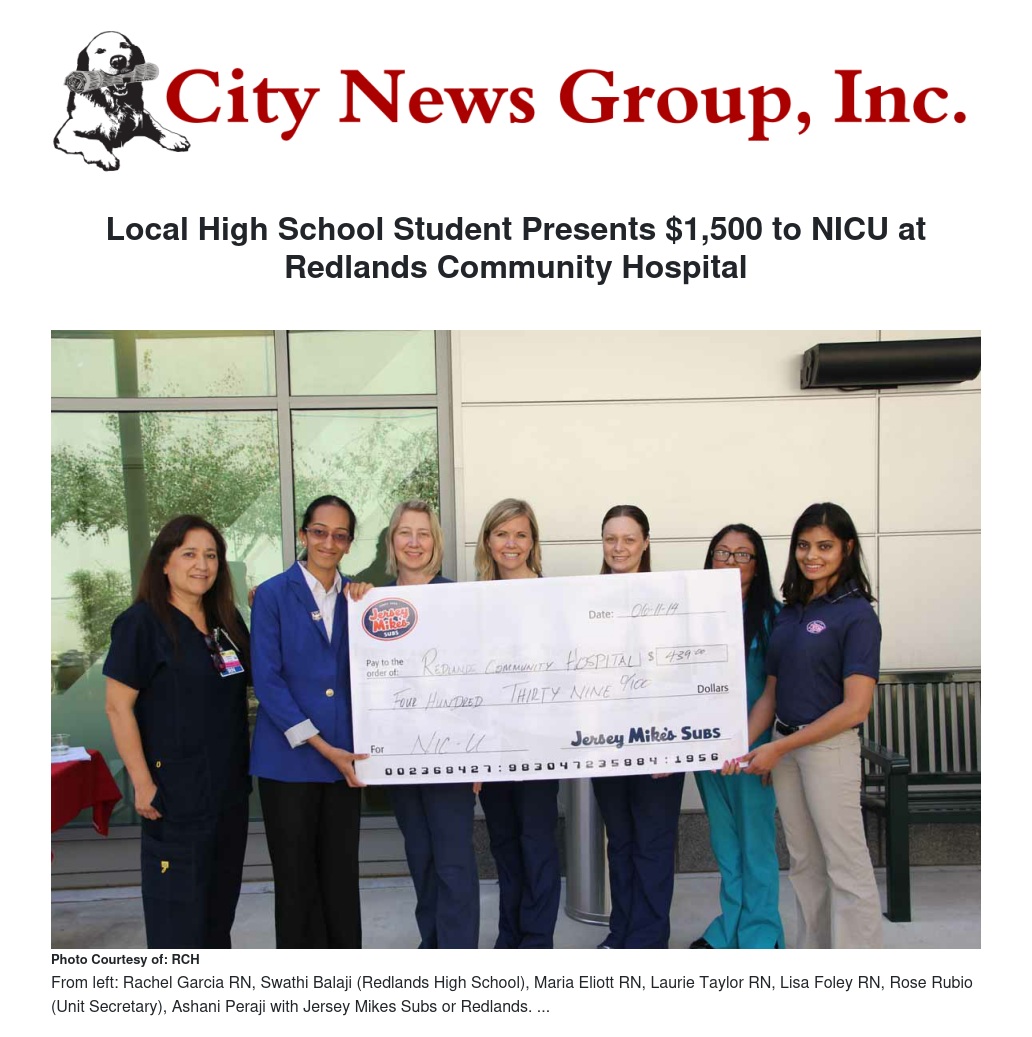 Redlands High School sophomore Swathi Balaji presented a check for more than $1,500 to the Neonatal Intensive Care Unit at Redlands Community Hospital.