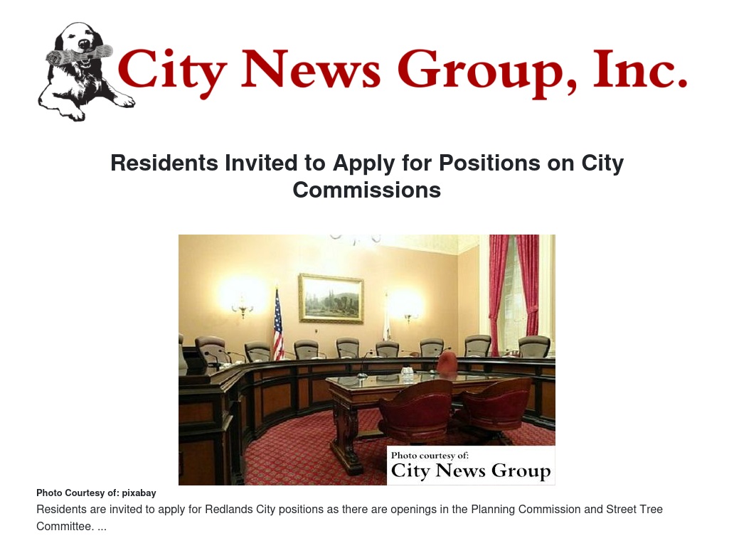 Redlands>>The City of Redlands invites residents to apply for openings on the Planning Commission and Street Tree Committee.