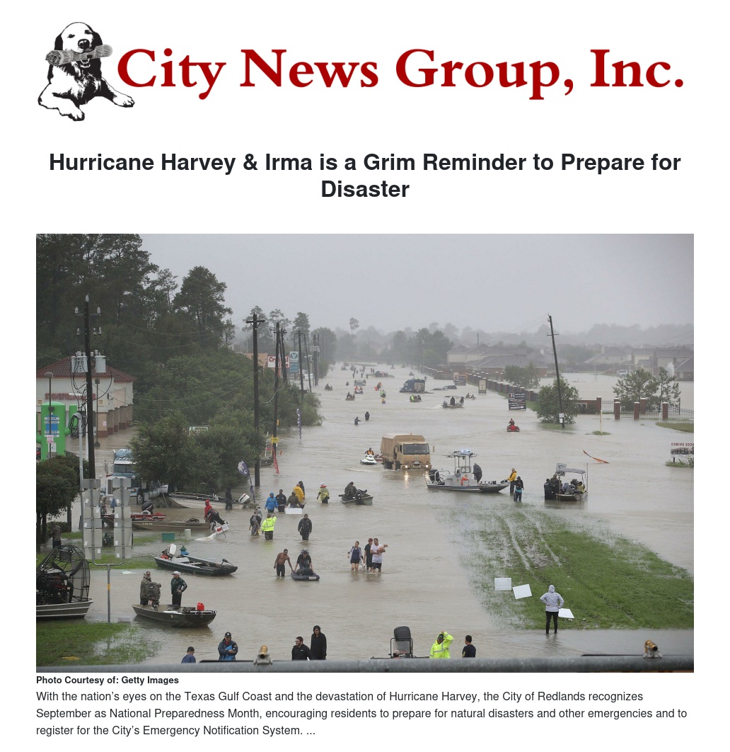 REDLANDS>> With the nation’s eyes on the devastation of Hurricane Harvey & Irma, the City of Redlands recognizes September as National Preparedness Month, encouraging residents to prepare for natural disasters and other emergencies and to register for the City’s Emergency Notification System.