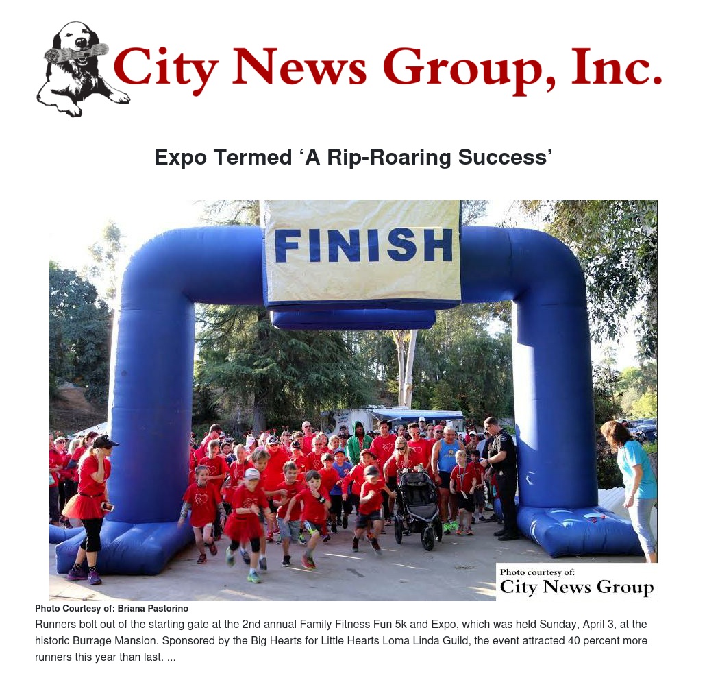 The 2nd annual Family Fitness Fun 5k & Expo, held Sunday morning, April 3, at the historic Burrage Mansion, was called “a rip-roaring success” by Dixie Watkins, co-president of the Big Hearts for Little Hearts Loma Linda Guild, sponsor of the event.