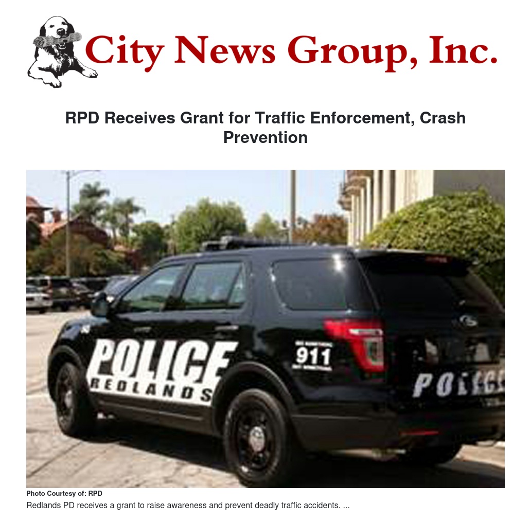 The Redlands Police Department has been awarded a $155,410 grant from the California Office of Traffic Safety (OTS) for a year-long program of special enforcements and public awareness efforts to prevent traffic-related deaths and injuries. The Redlands Police Department will use the funding as part of the city’s ongoing commitment to keep our roadways safe and improve the quality of life through both enforcement and education.