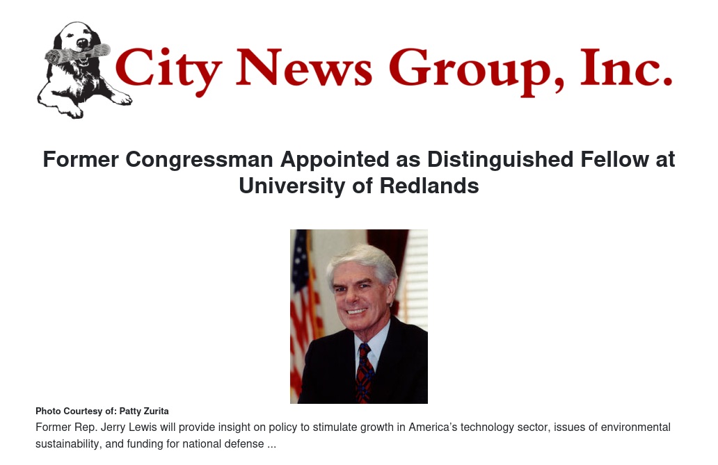 “In our culture of open debate and inquiry, where scholarship and practical experiences come together to forge new understanding, we welcome the illuminating discussions and context that an experienced legislator and government leader such as Jerry Lewis can offer our students,” said Ralph Kuncl, president of the University of Redlands. “What he brings is at the core of our mission: combining academic excellence with real-world experience.”