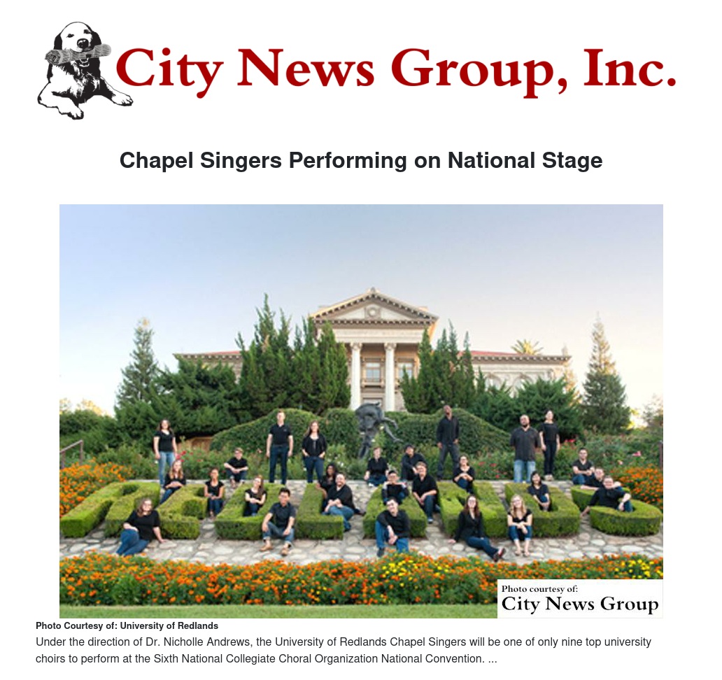Under the direction of Dr. Nicholle Andrews, the University of Redlands Chapel Singers will be one of only nine top university choirs to perform at the Sixth National Collegiate Choral Organization National Convention (NCCO), hosted at Portland State University Nov. 12-14, 2015.