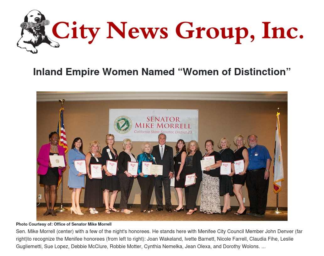 Over 70 Inland Empire women from the 23rd State Senate District were honored for their community work and service by state Sen. Mike Morrell, R-Rancho Cucamonga, in the 10th Annual Women of Distinction Ceremony and Dinner June 20 at the National Orange Show, where they received their accolades to a group of over 350 guests.