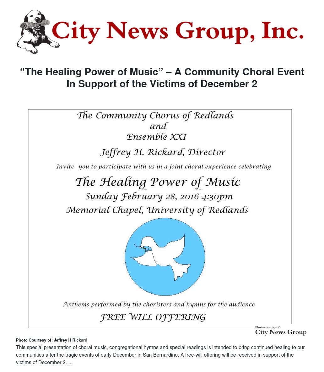 The Community Chorus of Redlands and Ensemble XXI through the sponsorship of The Chaplain’s Office of the University of Redlands, John Walsh, Omer E. Robbins, Chaplain, are hosting a special community choral event entitled: “The Healing Power of Music.”