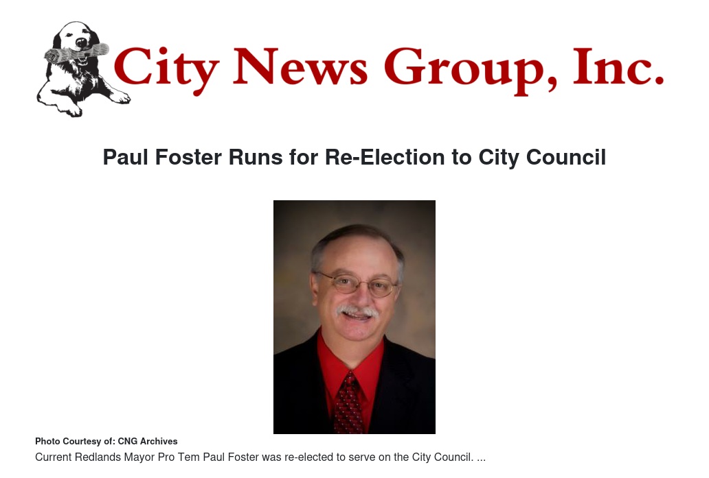 Foster, a San Diego native, said his “desire to serve the people of Redlands and continue to move our community forward in a positive manner” initiated his aspiration for re-election, something he felt would bring “continuity and stability” to the city.